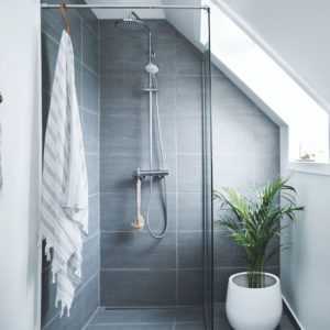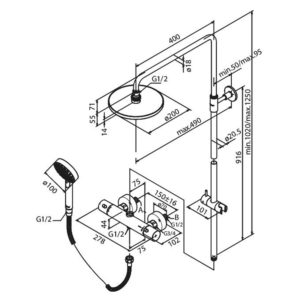 Komplett takdusj 200 mm med termostat og hånddusj. Justerbar lengde på stang 1020-125 0mm. Rub-clean funksjon på dusjhodet.