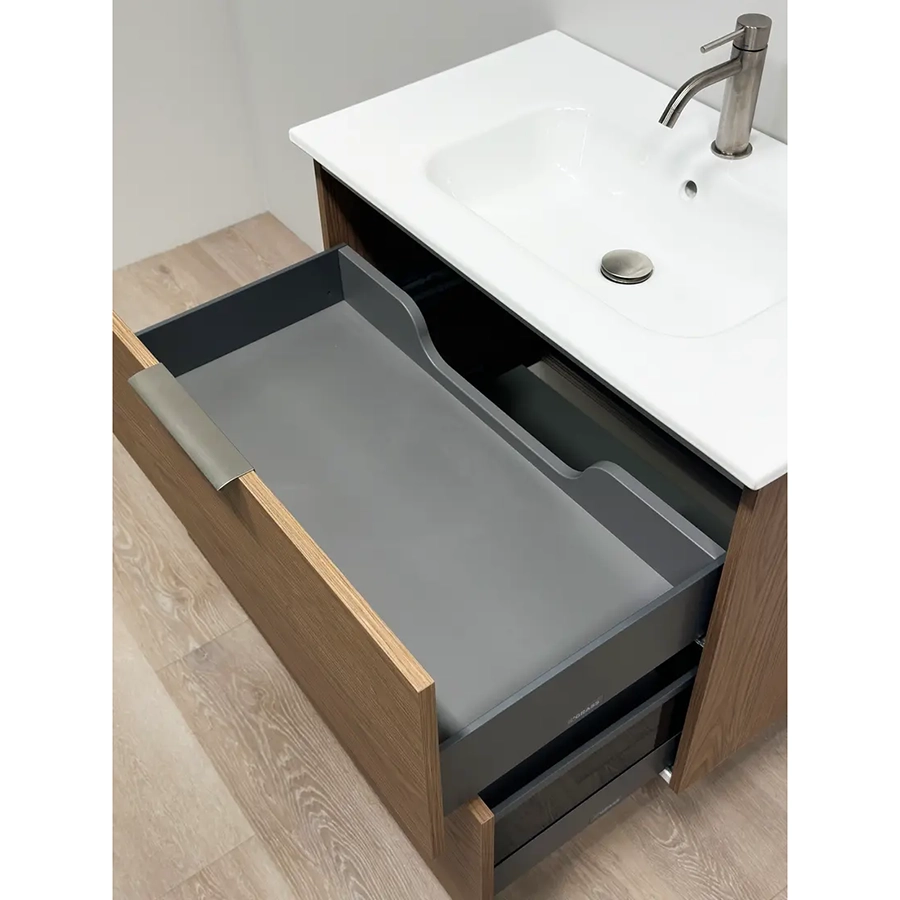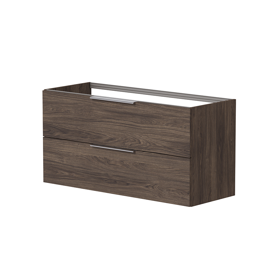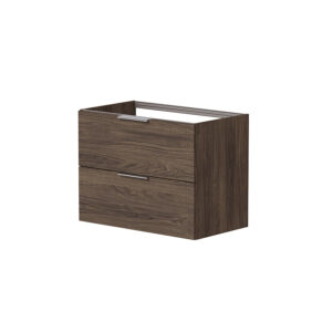 Den dype trefargen skaper kontrast og fungerer godt sammen med både lyse og mørke overflater. Møbelet har to skuffer med soft-close, hvor den nederste er ekstra høy og gir god plass til større produkter. Den øverste skuffen har utsparing for vannlås i bakkant og hel skuffebunn for maksimal utnyttelse av bredden. Glasshyller på sidene gir praktisk og lett tilgjengelig oppbevaring.