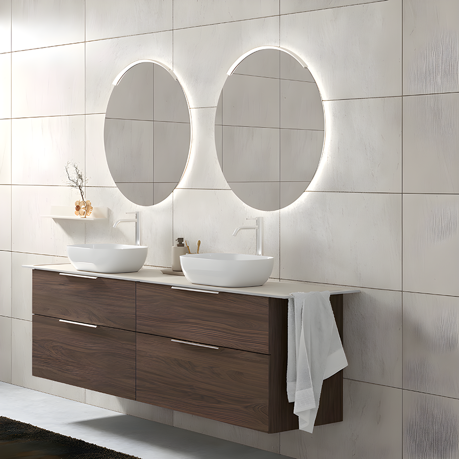 Du kan kombinere Lira med heldekkende servant for et rent og helhetlig uttrykk, eller velge benkeplate med bollevask for et mer møbelpreget og moderne design. Dette gir deg fleksibilitet til å tilpasse løsningen etter stil og behov.
