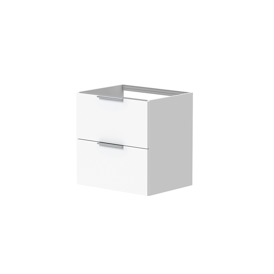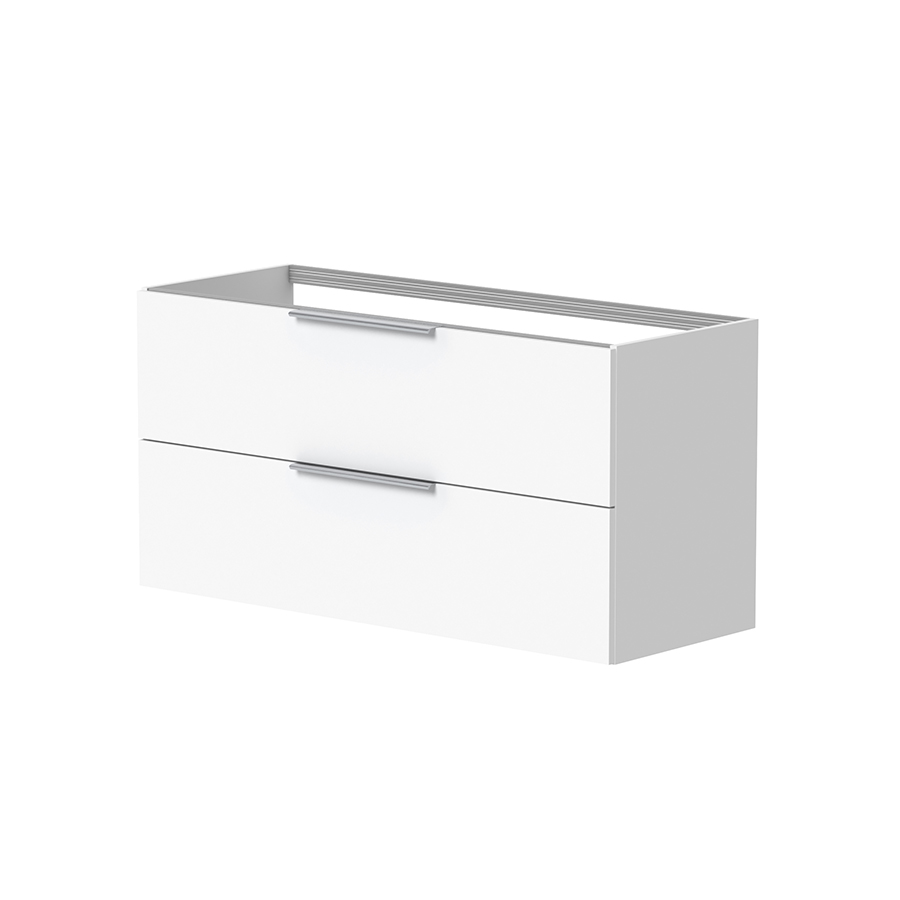 På sidene finner du åpne glasshyller som gjør det enkelt å organisere og ha det du bruker mest lett tilgjengelig. Begge skuffene leveres med antisklimatter som holder innholdet på plass og bidrar til en ryddig hverdag. Den øverste skuffen har utsparing i bakkant for vannlås, mens selve skuffebunnen er hel. Denne løsningen gir bedre utnyttelse av skuffens fulle bredde og mer sammenhengende oppbevaringsplass sammenlignet med mange andre baderomsmøbler med midtutskjæring.