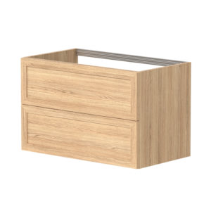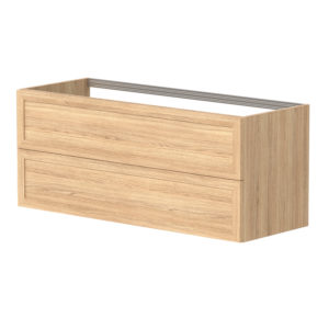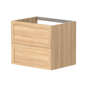 Underskapet på Rustic har en kombinasjon av heltre eik og eikefiner. Skuffene er hvite innvendig og inkluderer antisklimatter. Skinner i skuff med demping. Rustic-serien kommer med sorte matte grep inkludert. Det finnes flere andre ulike grep som kan bestilles som tillegg. Underskapet kan kombineres med benkeplate og bolleservant eller en klassisk heldekkende servant. Underskap leveres i to versjoner, servantskap som har utsparing til vannlås i den øverste skuffen og benkeskap som har hele skuffer både oppe og nede. Rustic-serien har høyskap med like grep som på skuffene. Høyskapet har glasshyller og dørene kan monteres høyre/venstre. Speil med ramme i heltre eik kompletterer kolleksjonen.