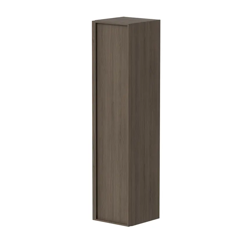 Sole høyskap er utviklet for å utfylle servantskapet i samme serie og har den samme naturlige, mørk grå eikeoverflaten som gir et helhetlig og moderne uttrykk på badet. Selv uten spilene viderefører høyskapet den rene designlinjen som kjennetegner Sole-serien. Den mørke eikefinishen tilfører varme og dybde, samtidig som det stramme formspråket gjør skapet enkelt å kombinere med ulike materialer og overflater.