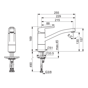 Kjøkkenkran med svingbar tut og keramisk avstengning for oppvaskmaskin (ON/OFF). Tutens svingradius er forhåndsinnstilt på 120° (kan begrenses til 40-80°). Det er også innebygd alternative begrensninger for vanntemperatur og maksimal vannmengde. F = fleksible slanger. Oras Saga er en konkurransedyktig tidløs designlinje for moderne prosjektkjøkken.