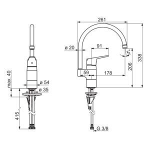 Kjøkkenkran i matt sort, med høy svingbar tut og strålesamler. Tutens svingradius er fabrikkinnstilt på 120° (kan begrenses til 40–80°). Justerbar sokkel som gjør at tuten monteres bak, til høyre eller venstre på krankroppen ved installasjon. Hendelen er utstyrt med en økoknapp som kan begrense vannmengden. Funksjonen oppheves enkelt ved trykke på knappen. Sikker i bruk og vannbesparende. Oras 3S-Installation for enkel, sikker og rask montering.
