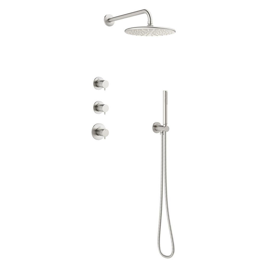 Med termostat og mengdestyring montert på separate rosetter får du en minimalistisk og stilren dusjløsning – uten synlige plater. Den veggmonterte dusjarmen gir takdusjen et rent og arkitektonisk uttrykk, mens den tubeformede hånddusjen gir fleksibilitet og et visuelt lett uttrykk. Begge dusjhodene er utstyrt med Rub-Clean-teknologi, som gjør det enkelt å fjerne kalk – du drar bare fingeren over dysene.