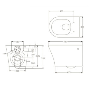 Kantfri toalett inkludert avtagbart sete med dempelukking. Det medfølger propper for å dekke hullene i sidene. Standard bolteavstand 180 mm.