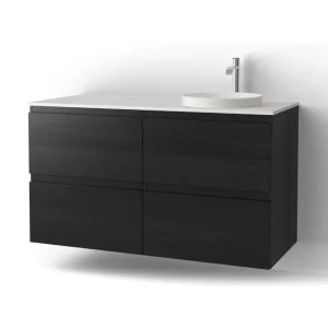 Flow-serien fås i breddene 500, 600, 750, 1000, 1200, 1500 og 2000 mm (mål er uten fronter), med finerte eller malte dører i alle våre standardfarger. Du kan velge enten Flow servanten i Top Solid med Easy Clean-vannlåsen og åpen bunnventil, eller den halvt nedfelte ovale/runde servanten Zone i Solid Surface med topplate i Solid Surface, komposittsteinen Moorland Fog eller Turbine Grey samt standard vannlås. Skuffene har gummimatter og to Mejram skuffinndelinger. Se tillegg for flere muligheter.