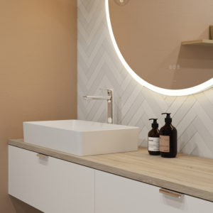 MIE baderomsmøbel har et smartsystem, som gjør at du enkelt kan endre farge og utførelse på skuffefronter eller sidepanel – uten å bytte møbel. Ønsker du med tiden møbelet i en annen farge og/eller utførelse, kan du bestille nye fronter og sidepanel, og enkelt bytte dem ut selv.