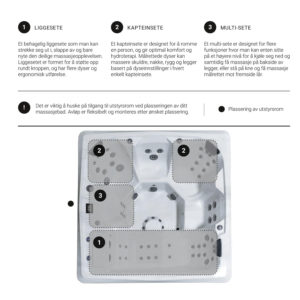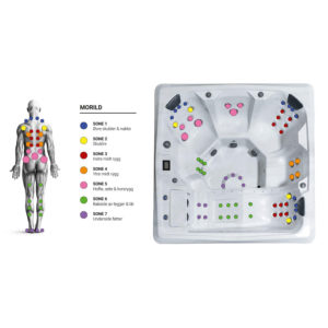 Et behagelig liggesete som man kan strekke seg ut i, slappe av og bare nyte den deilige massasjeopplevelsen. Liggesetet er formet for å støtte opp rundt kroppen, og har flere dyser og ergonomisk utførelse. Et kapteinsete er designet for å romme en person, og gir optimal komfort og hydroterapi. Målrettede dyser kan massere skuldre, nakke, rygg og legger basert på dyseinnstillinger i hvert enkelt kapteinsete. Et multi-sete er designet for flere funksjoner hvor man kan enten sitte på et høyere nivå for å kjøle seg ned og samtidig få massasje på bakside av legger, eller stå på kne og få massasje målrettet mot fremside lår. Morild har flere dyser og 2 pumper (med 2 trinns hastighet) som gir meget god massasjeeffekt. Det er også LED lys og vannfall som gir en flott opplevelse i de stille skumringstimene.
