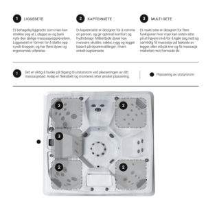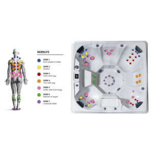 Et kapteinsete er designet for å romme en person, og gir optimal komfort og hydroterapi. Målrettede dyser kan massere skuldre, nakke, rygg og legger basert på dyseinnstillinger i hvert enkelt kapteinsete. Et multi-sete er designet for flere funksjoner hvor man kan enten sitte på et høyere nivå for å kjøle seg ned og samtidig få massasje på bakside av legger, eller stå på kne og få massasje målrettet mot fremside lår. Nordlys har flere dyser og 2 pumper (med 2 trinns hastighet) som gir meget god massasjeeffekt. Det er også LED lys og vannfall som gir en flott opplevelse i de stille skumringstimene.
